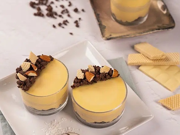 Tak, crumble zostało opracowane tak, by zachowywać chrupkość nawet w kontakcie z wilgotnymi lub zimnymi komponentami deseru – dzięki temu idealnie sprawdza się również jako warstwa wewnętrzna lub wierzchnia.